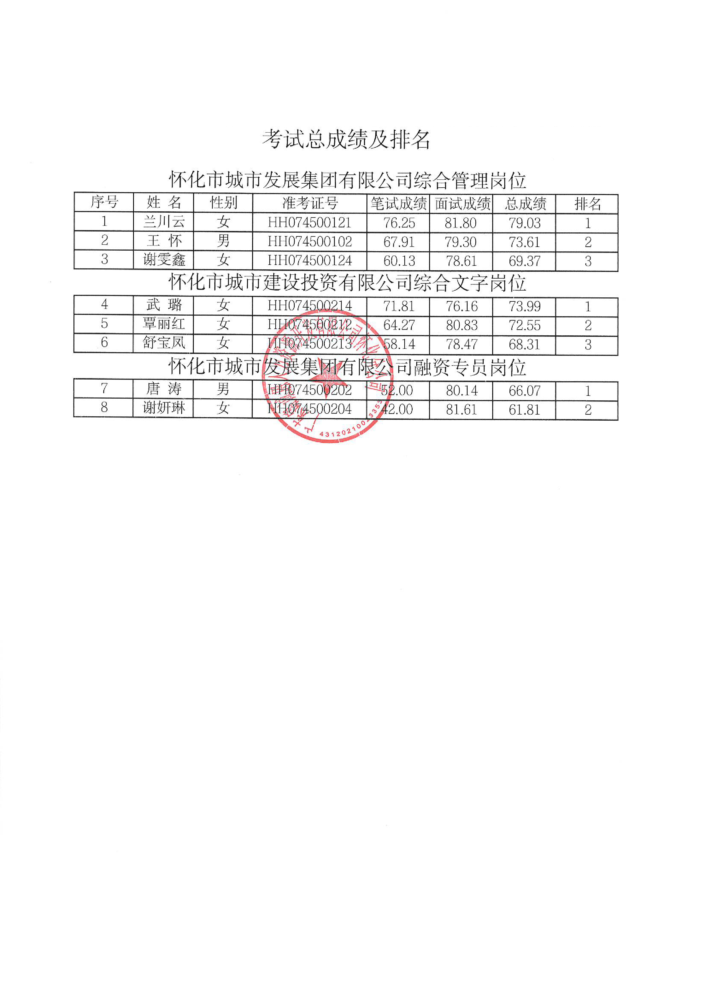 懷化市城市發(fā)展集團(tuán)有限公司2023年校園招聘面試入圍考生考試總成績及排名