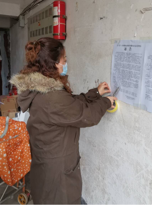 突擊隊(duì)員劉文麗張貼疫情防疫通告
