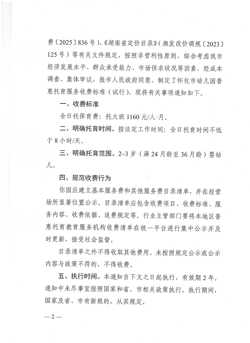 關(guān)于制定懷化市幼兒園普惠托育服務(wù)收費標準(試行)的通知