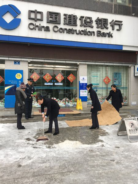 1月25日,建行懷化分行網(wǎng)點(diǎn)啟動(dòng)應(yīng)急預(yù)案,鏟冰掃雪、鋪設(shè)紅地毯,進(jìn)一步做好冰災(zāi)期間營(yíng)業(yè)網(wǎng)點(diǎn)的客戶服務(wù)工作(王承 攝)