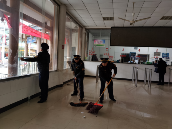 圖2 黨員志愿者們正在打掃汽車站售票大廳