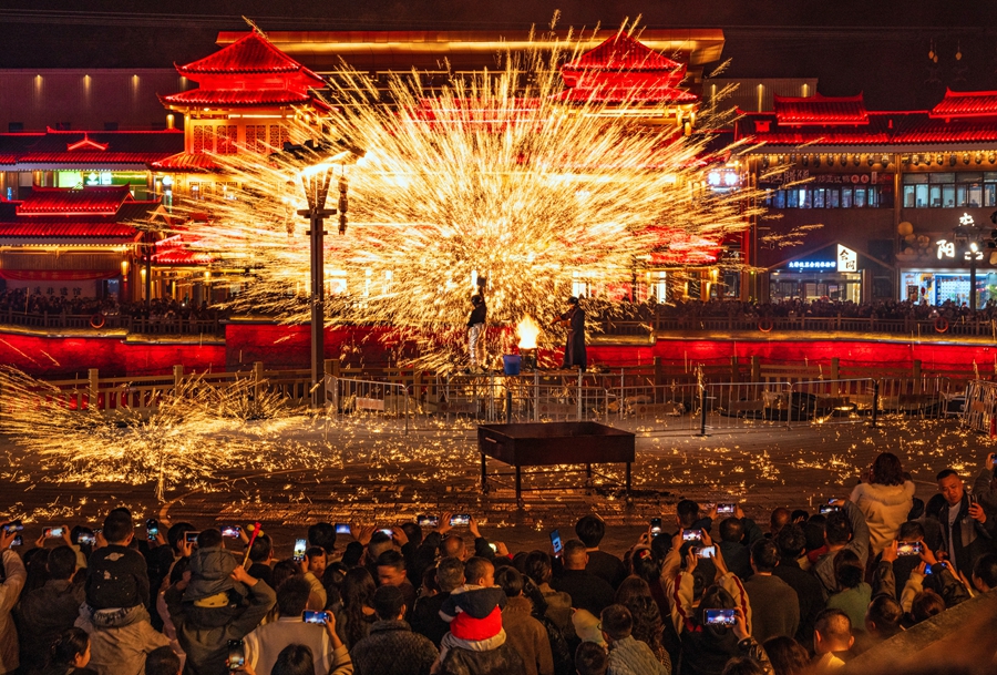 馬年春節(jié)即將來臨,榆樹灣青春廣場開啟了“大楚中國年燈火榆樹灣”演出季,為來自五湖四海的游客奉獻(xiàn)一場精彩紛呈的文藝演出,共度歡樂春節(jié)。圖為2月14日晚的《打鐵花》民俗表演。(吳立波 攝)