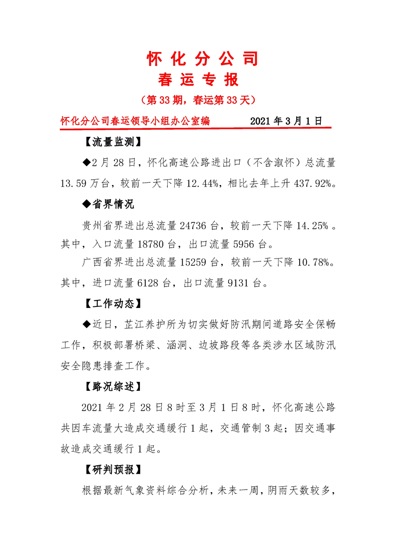 省高速集團(tuán)懷化分公司第33期春運(yùn)專報(bào)