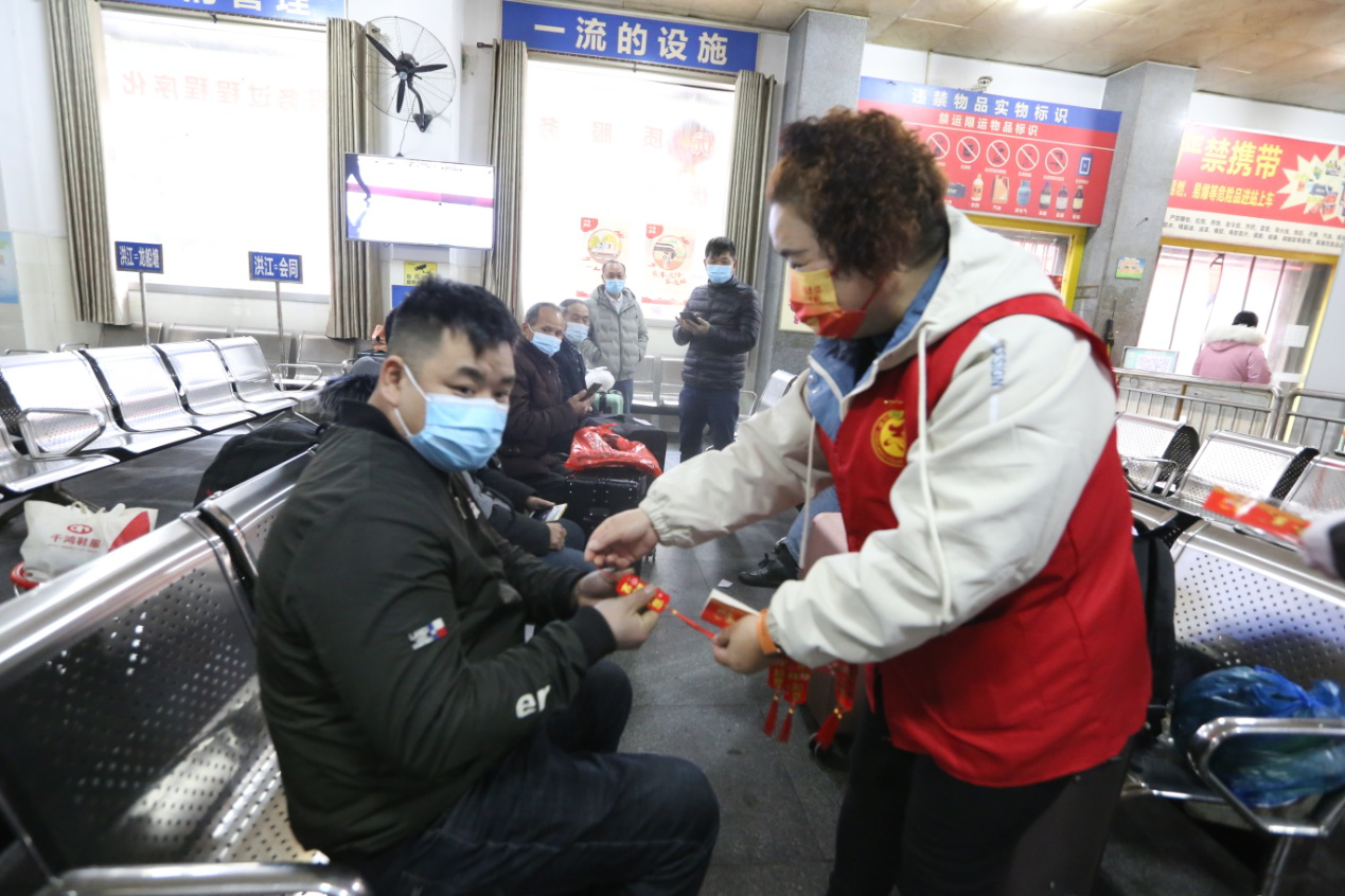 志愿者為春運首天首批幸運旅客送上專屬福袋和祝福。隨后,志愿者一起為候車大廳掛燈籠、貼福字,為旅客營造濃厚的節(jié)日氛圍,并圍繞重點旅客開展搬運行李、票務協(xié)助等志愿服務,做好疫情防控、安全生產(chǎn)等宣傳。(洪江區(qū)春運辦)