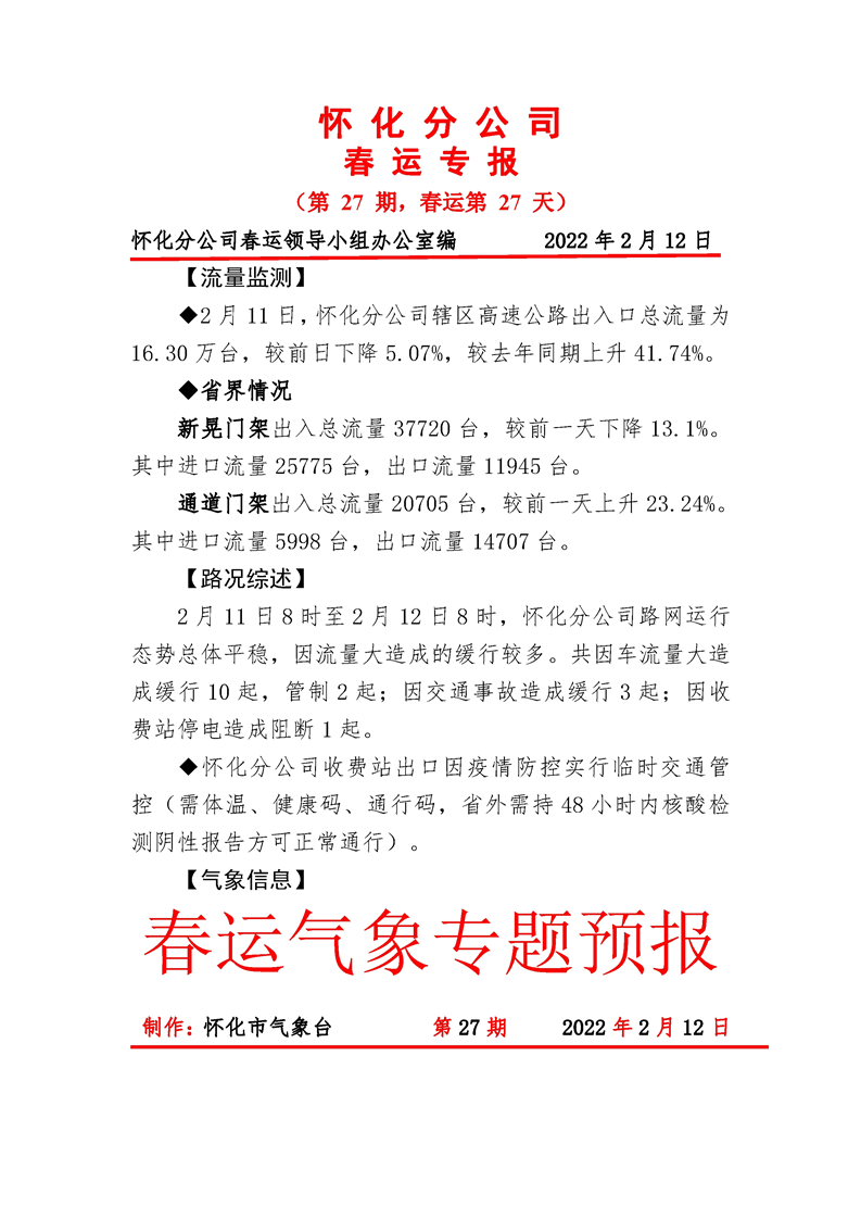 2022年高速懷化分公司第27期春運(yùn)專報(bào)