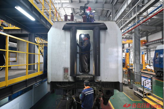 (1月13日,在懷化機(jī)務(wù)段檢修庫內(nèi),3名工作人員位于車上、車中、車下位置同步檢修HXD1型電力機(jī)車。)