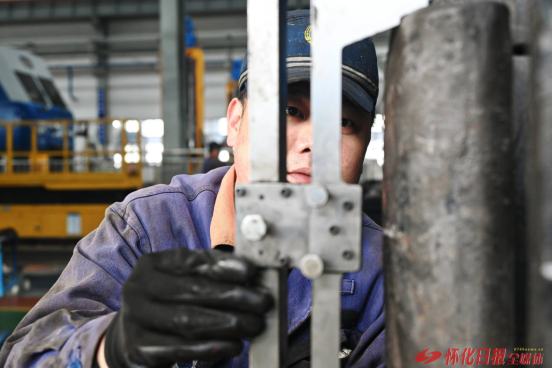 (1月13日,在懷化機(jī)務(wù)段檢修庫內(nèi),工作人員正在測量HXD1型電力機(jī)車車鉤高度。)