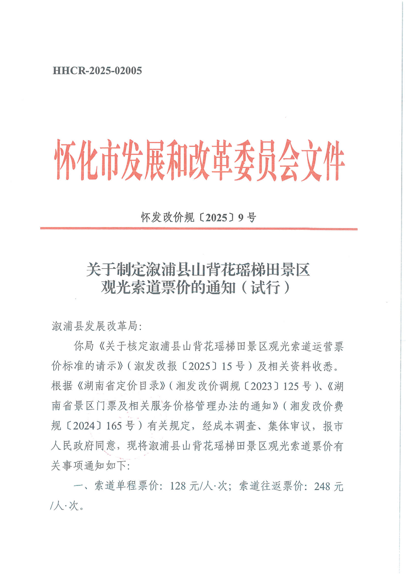 關于制定溆浦縣山背花瑤梯田景區(qū)觀光索道票價的通知(試行)