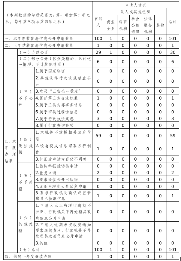 2025年,本機(jī)關(guān)嚴(yán)格依照《條例》開展工作,堅(jiān)守“公開為常態(tài)、不公開為例外”原則,規(guī)范依申請(qǐng)公開全流程管理。全年共接收政府信息公開申請(qǐng)101件,上年結(jié)轉(zhuǎn)1件,其中自然人申請(qǐng)100件、法人或其他組織申請(qǐng)1件,申請(qǐng)內(nèi)容集中于物業(yè)組建信息、征拆項(xiàng)目信息、居委會(huì)組建資料等民生領(lǐng)域;辦理結(jié)果中予以公開27件、部分公開6件、不予公開4件、無法提供60件、不予處理3件、結(jié)轉(zhuǎn)下年度繼續(xù)辦理1件,所有申請(qǐng)均在法定期限內(nèi)規(guī)范答復(fù),時(shí)效性和規(guī)范性顯著提升。行政復(fù)議與行政訴訟方面,全年因政府信息公開工作被申請(qǐng)行政復(fù)議42件,經(jīng)審理維持4件、糾正2件、申請(qǐng)人撤回31件,未審結(jié)5件,針對(duì)復(fù)議糾正問題已及時(shí)整改;發(fā)生相關(guān)行政訴訟案件3件,含未經(jīng)復(fù)議直接起訴1件、復(fù)議后起訴2件,所有案件均依法應(yīng)訴。下一步,本機(jī)關(guān)將根據(jù)行政復(fù)議和行政訴訟暴露的問題,進(jìn)一步優(yōu)化政府信息公開申請(qǐng)辦理流程、細(xì)化公開標(biāo)準(zhǔn),持續(xù)提升政府信息公開工作規(guī)范化水平。