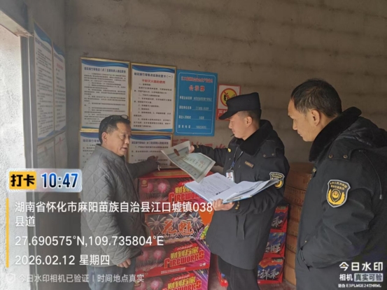 2月12日,麻陽江口墟鎮(zhèn)綜合執(zhí)法大隊一行到轄區(qū)商鋪、煙花爆竹零售店開展歲末年初煙花爆竹安全生產(chǎn)檢查。